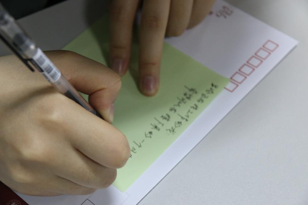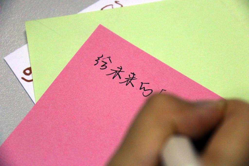 紧接着诚信就业班会的是由心理委员刘思彤主持的“小小心愿——致两个月后的自己”心理沙龙。每个人都得到了一张彩色卡片,在十五分钟的时间里认真地给两个月后的自己写下一些小心愿或小目标,封装起来交由心理委员集中保存。大家许诺,会力争在两个月内努力实现这些小心愿小目标,两个月后毕业时再重新翻出纸张,检阅自己的完成情况。在这样的小小仪式之下,大家静下心来总结过去,展望未来,抒写期盼。