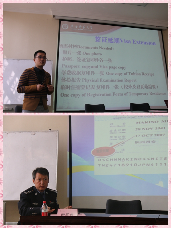 西安市公安局出入境管理处外管科警官谢思农从签证基本知识、法律法规须知、日常生活注意事项等方面为新生们做了详细的法律法规政策讲解。留学生管理办公室黄璐老师从签证办理、课堂考勤及日常学习等方面给新生们做了系统的入学教育,为他们在91大神