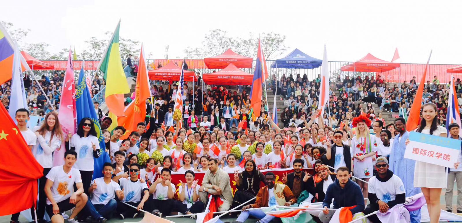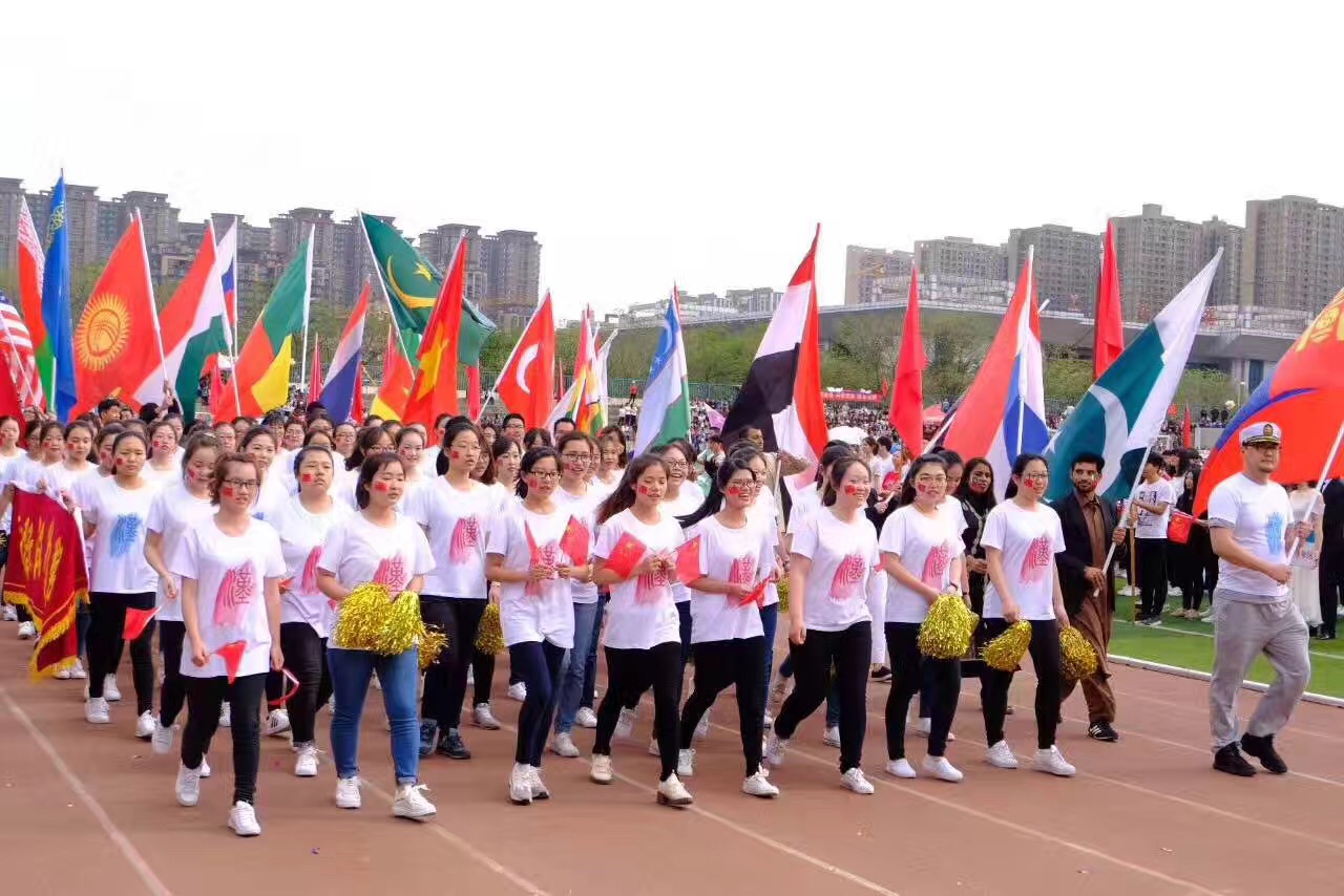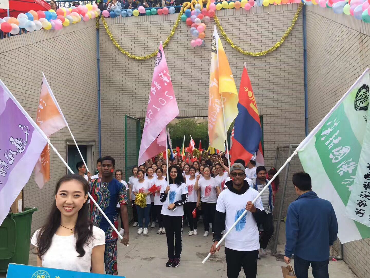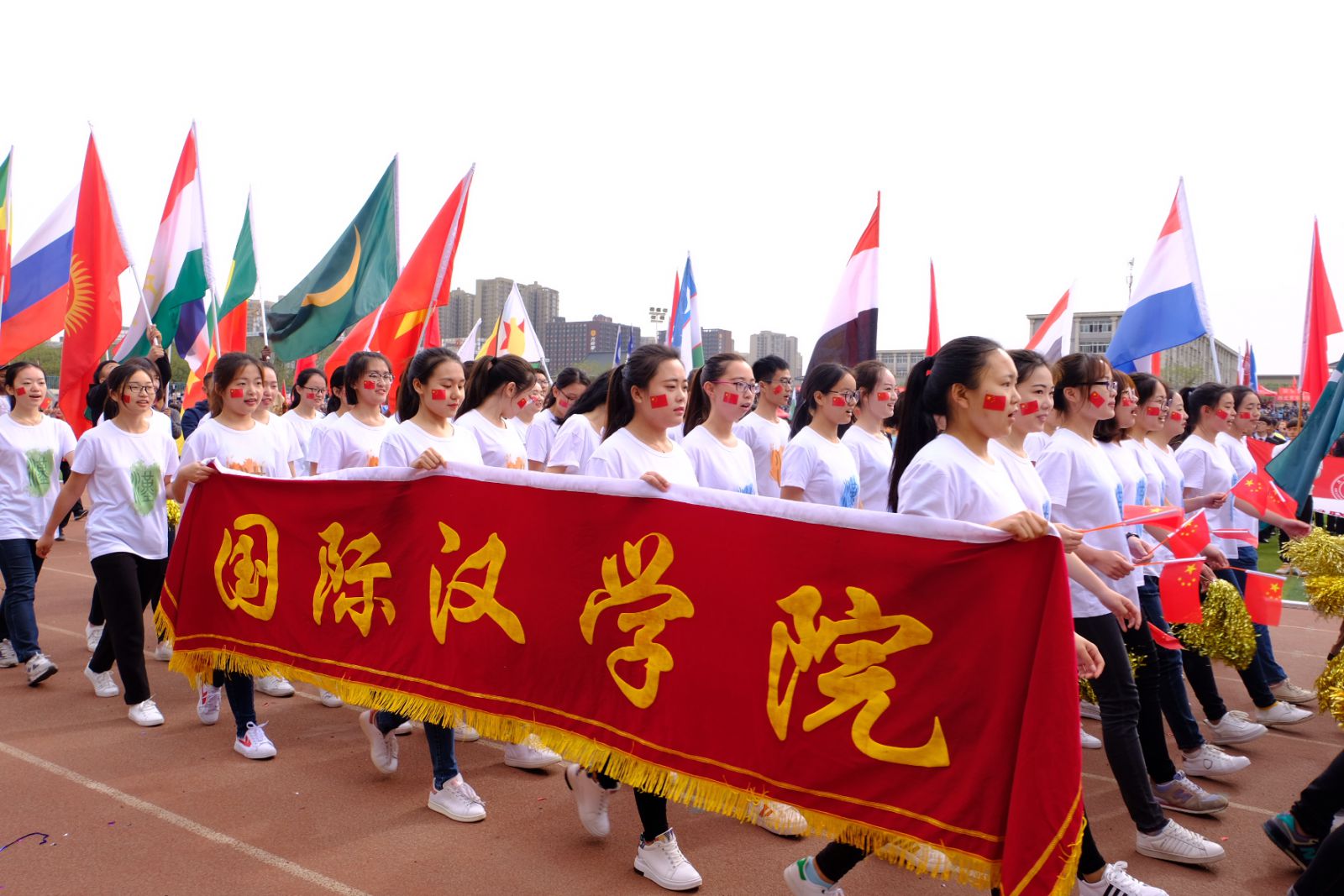 “五洲青年,魅力无限,同舟共济,携手向前”。伴随着响亮的口号,国汉院中外学生共同组成了绿、蓝、红、橙四种颜色的方阵,昂首挺胸,迈着整齐的步伐走过主席台。多国国旗猎猎飞扬,精心设计的“汉”字方阵造型,象征着学院的国际化,多元化,也象征着学院传播与发扬中华文化的使命。