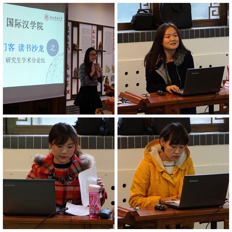 在教学二楼二层中国文化体验室成功举办了“黉门客”读书沙龙之研究生学术论坛第三期。本期论坛的主题是“跨文化交际”。2016级汉语国际教育专业的高歌然、王晓楠,刘雨菡三位同学对她们的论文进行了简要报告,91大神