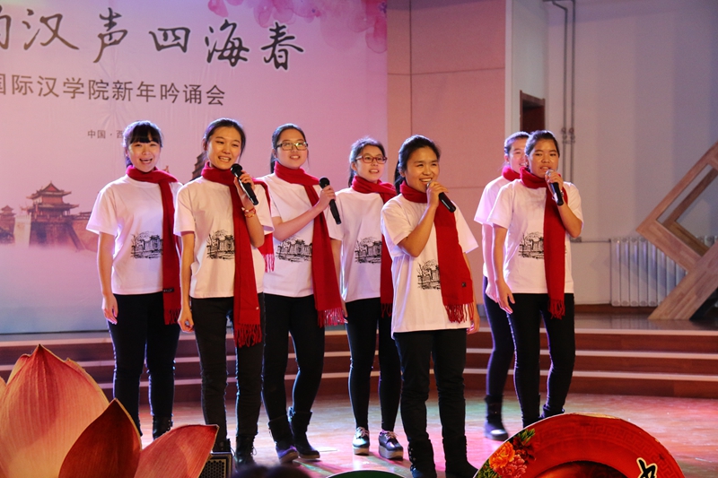 “朗读,让静态的文字变成了一种动态的呈现。”吟诵会上,别开生面的原创改编作品也让观众们赏心悦目,大饱耳福。2012级对外汉语本科班的同学们来自五湖四海,分别用普通话与方言演绎了诗人舒婷的《致橡树》,令人在怀念之余也不禁莞尔一笑。2011级对外汉语本科班的同学们则以情景朗诵的形式献上了《我在冬天怀念那春夏秋的回忆》,表现了大学四年令人难忘而又精彩纷呈的校园生活。