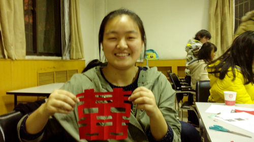 晚7:00,活动准时开始。活动中参与者被分为7组,活动围绕了解剪纸、熟悉剪纸的剪法、抽取主题、通过游戏抢夺道具、制作主题剪纸等环节展开,由国际部部员负责带领外国留学生了解、制作剪纸。参与者了解完剪纸的相关视频——《剪纸姑娘》后,剪纸的制作正式开始。活动中还穿插了精彩的抢道具游戏环节,两轮游戏各具特色,充分体现了设计者的匠心独运。尤其是第二轮游戏“水果蹲”,由于参与度更广,可操作性更强,全场气氛空前热烈。