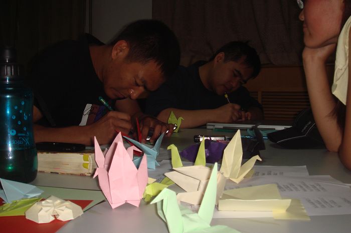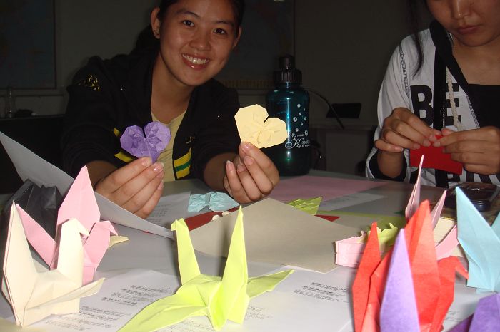 首先,由“荧光”爱心社主席樊金莲同学为来自蒙古、韩国、加拿大等世界各地的外国留学生介绍“荧光”爱心社的宗旨,并为大家播放了社团走出校门做各项社会志愿服务活动的视频:敬老院献爱心,儿童村教课,曲江义务打扫……一幕幕感人的画面在外国友人面前重现,志愿者们脸上真诚灿烂的笑容打动着在座的各国朋友们。视频播放过后,伴着悠扬的轻音乐,“荧光”爱心社的七名志愿者与外国朋友们交流了各国志愿者协会的发展、大学生的社会责任等主题,分享了社会服务的快乐与感动。五十分钟的讨论引起了外国留学生对中国社会志愿服务的强烈兴趣,纷纷表示要与“荧光”志愿者协会一起走进敬老院,儿童村,为社会也贡献出自己的一份力量。“荧光”爱心社的同学把准备好的彩纸拿出来,教外国朋友们叠千纸鹤,爱心,把祝福的话写在上面,给那些需要帮助的人们寄出他们的祝福。最后,大家一起合唱《感恩的心》,志愿者们边唱边交给外国朋友们用手语表达。真诚、温暖充满了整个教室,祝福与微笑伴着感人的旋律已飞到了每一个需要爱的角落……