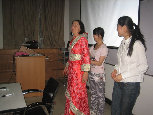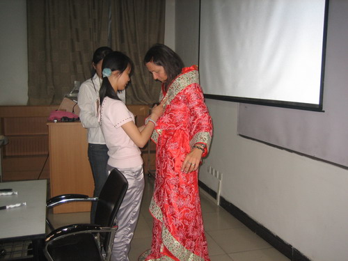 西安以十三朝古都文明于世,尤其是汉唐两朝,政治经济文化都发展到了一定的高度,呈现出特有的色彩。本期汉语角从生活中服饰这一基本因素为基点介绍当时社会发展状况及人们的生活习惯。这次活动吸引了来自德国、加拿大、韩国、蒙古等国家的留学生前来聆听学习。活动伊始,身着汉服的曹雯苓以其姣好的身材可人的容颜将汉服的文化表现得淋漓尽致,吸引众外国友人纷纷前来合照。活动现场气氛热烈,中国风浓厚。接着主讲人王静以其流利畅晓而又生动的语言辅以精美的图片将汉唐服饰文化一一描述,具体讲解了汉唐服饰的不同特点、形式、颜色以及服饰对人们身份地位的影响,观众深深为之陶醉。现场的汉唐服饰表演更让外国友人激动不已,来自德国的葛玉和蒙古的莎丽洁不禁跃跃欲试,亲自身着汉衣唐装体验中国服饰的文化魅力,为活动增添异国风情的色彩。在之后的自由讨论中留学生与中国学生一起切磋了汉唐时期人们的生活习俗与各国和现代人们生活的差异不同,在交流中体会了中国古朴的民情、文化的博大精深及世界的多元化和现代化。