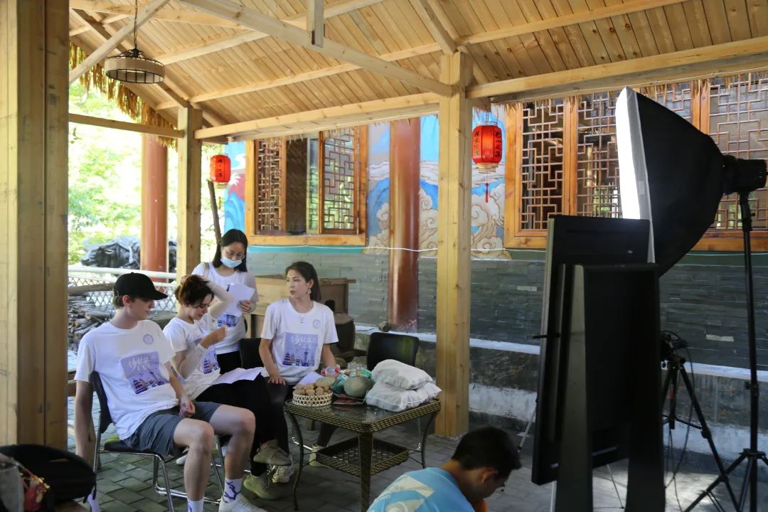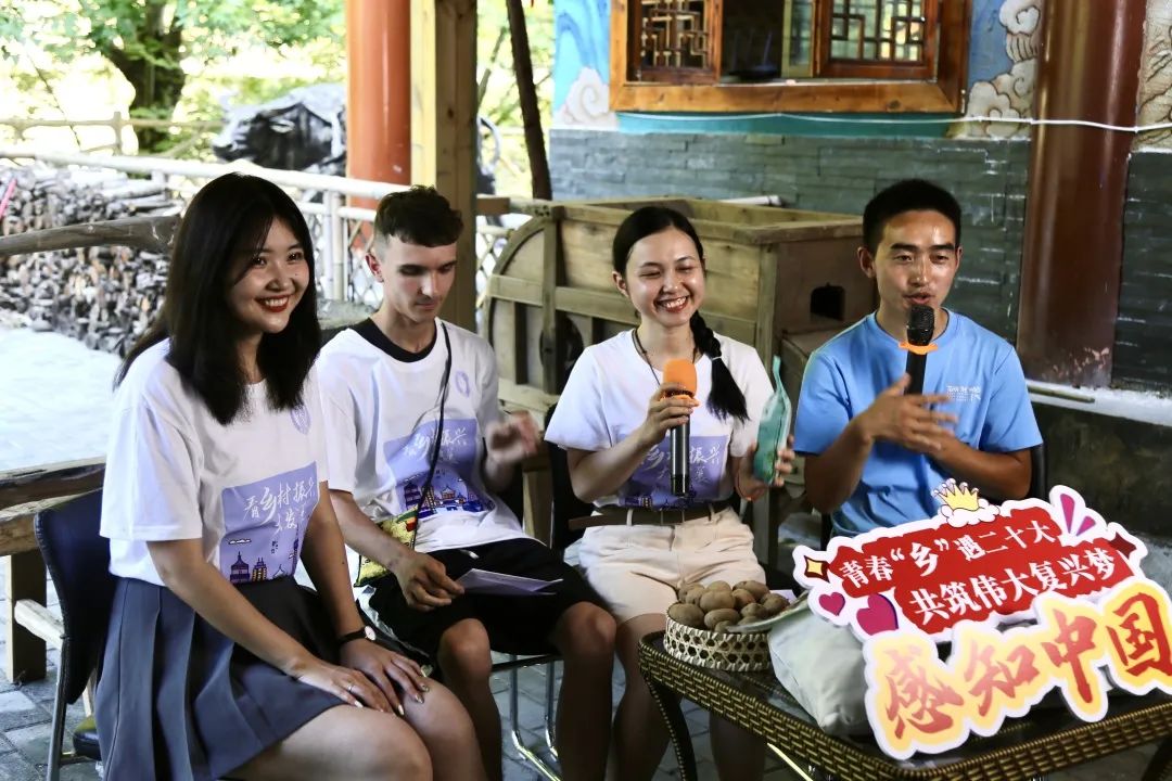中外学生一同来到岚皋县助农产品直播间体验助农产品直播活动,见岚皋县农创青年宋光军正在抖音直播间介绍岚皋当地特色农产品,留学生也主动参与助农产品直播。