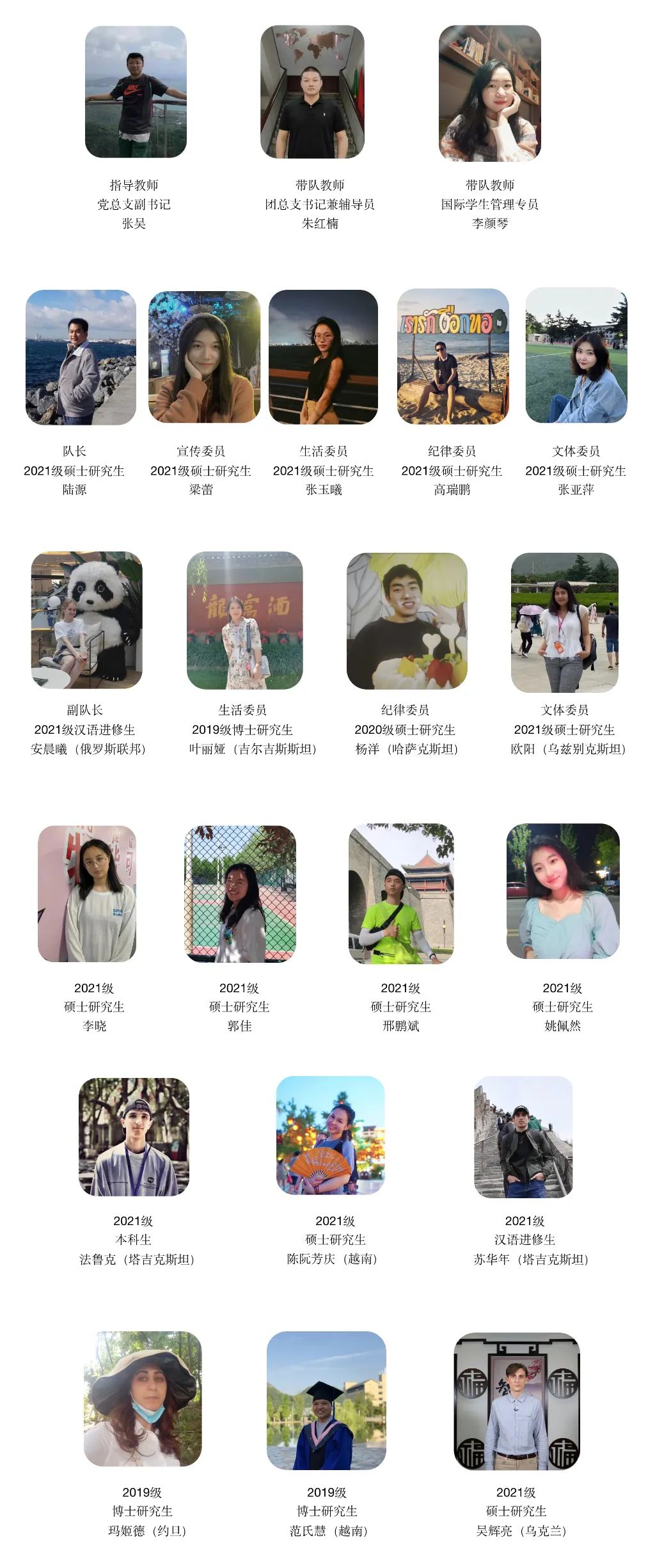 本次实践团队由张昊作为指导教师,实践团队中学生队伍由23名不同年级、不同专业、不同国籍的中外博士生、研究生、本科生共同组成,涉及汉语国际教育、语言学及应用语言学、食品化学等专业,涉及中国、哈萨克斯坦、俄罗斯、越南、约旦、保加利亚等10个国家。中外青年将共访杨家院子、桂花村、嘉瑞祥农产品公司,深入了解脱贫攻坚在农业方面的特色成果,见证农业现代化;以及前往麦溪小学、城关九年制中学,为基础教育提供助力,同时通过中外学生与当地中小学师生的交流互动,让中外学生深入感知我国基础教育事业发展现状。
