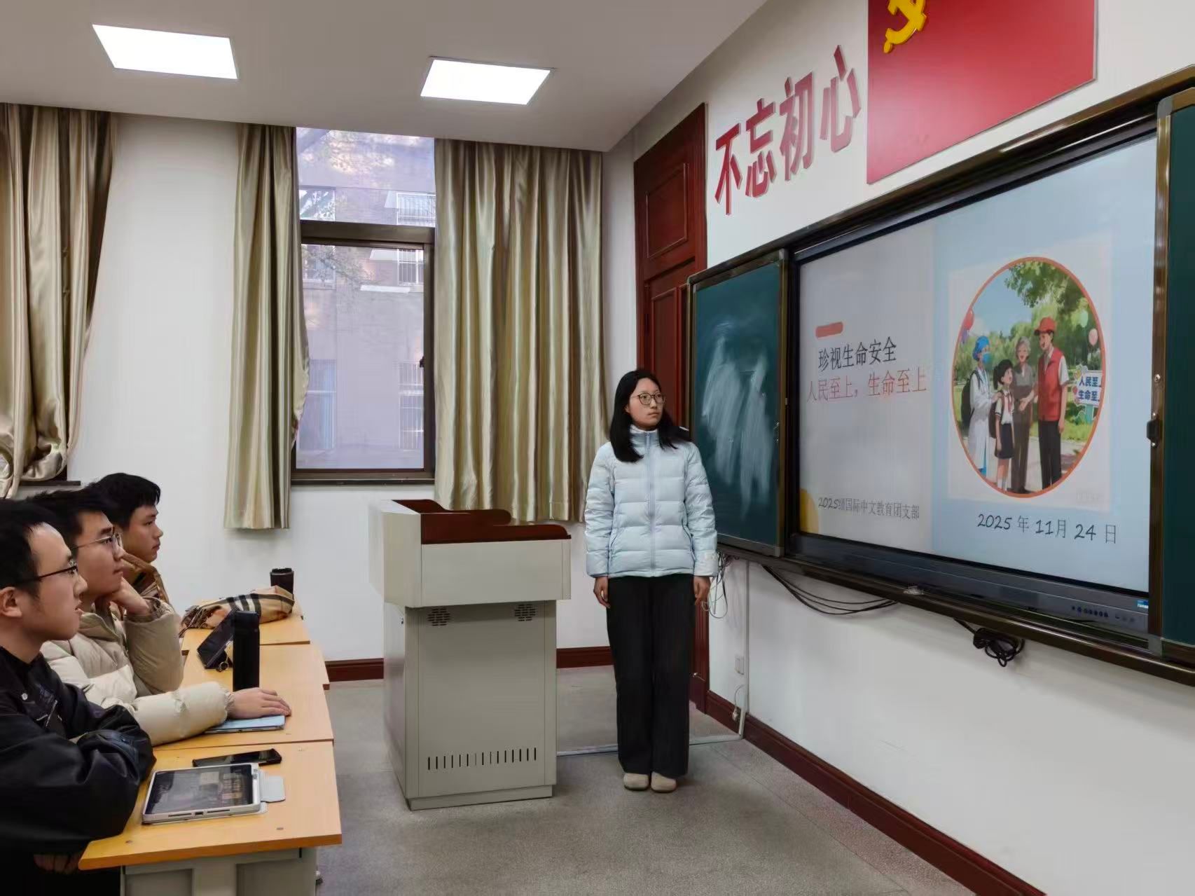 11月24日,国际中文教育2025级研究生团支部开展了“珍视生命安全——人民至上,生命至上”主题团日活动,全班同学踊跃参与。活动以真实、鲜活的安全案例分享拉开序幕,从校园交通、宿舍防火、食品安全、网络安全及心理健康等几个角度,结合真实案例进行了深入浅出的讲解,为同学们敲响了安全警钟。在小组讨论环节,大家围绕“身边的隐患”和“可行的防护对策”积极建言。各小组代表在总结发言中提出了不少切实可行的建议,如建立宿舍安全值日制度、组建班级防诈信息共享群等,充分展现了同学们的主人翁意识和集体责任感。