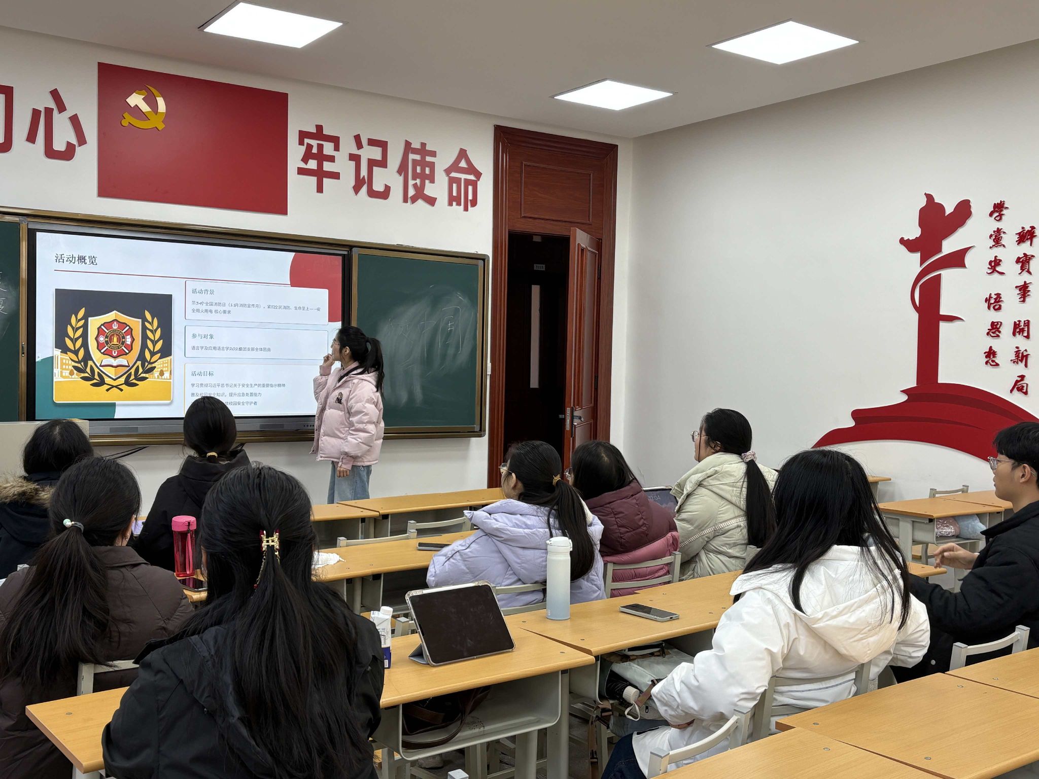 三、语言学及应用语言学2025级团支部语言学及应用语言学2025级团支部于11月21日以“消防护万家——人民至上、生命至上”为主题开展团日学习活动。活动紧扣第34个全国消防日与消防宣传月“全民消防、生命至上——安全用火用电”的主题,围绕“意识引领、案例警示”引导团员重视消防安全,筑牢安全防线。团支部书记柳星带领全体同学深入学习习近平总书记关于安全生产的重要论述和重要指示批示精神,结合消防宣传月官方报道,深刻领悟“人民至上、生命至上”的内涵。随后,全体同学观看了消防警示教育短片,一幕幕触目惊心的画面让大家直观感受到忽视安全可能带来的严重后果。在交流环节,同学们结合校园实际,就如何防范火灾风险、规范用电行为等展开热烈讨论。大家纷纷表示,要从点滴做起,争当校园安全的践行者和宣传员,真正把“安全无小事,生命大于天”的理念内化于心、外化于行。