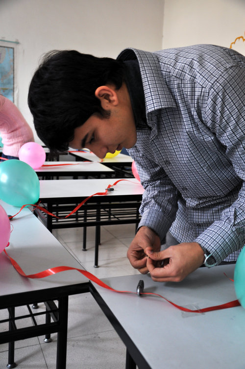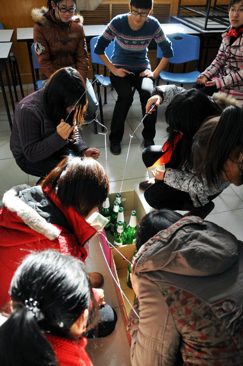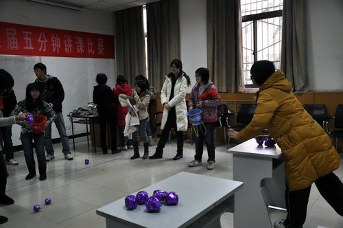中国特色的游戏同样吸引了留学生的极大兴趣,他们先是在门口观战,偷偷地记下技巧、窍门,然后和同场的中国学生对决PK。尤其在同心锁游戏中,他们一边给锁和钥匙对号入座,一边回答主持人的问题,欢乐的同时还巩固了自己的汉语知识。学院的老师们也被同学们的游乐精神感染,纷纷加入到游戏中来。师生同乐,好不热闹。赵学清副院长打破了吸乒乓球游戏的最高纪录,着实让学生们大呼惊叹。