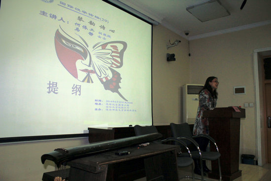 马静女士在表示了对师大学术氛围的敬仰之情后,为大家演奏了一只古琴曲《阳关三叠》,并利用古诗《送元二使安西》启发学生感受古琴与古诗的意境之美。随后何依工副教授对演奏进行了点评,他认为,学习古代文学要有一颗“诗心”,与弹奏古琴一样,身心要达到安静的状态,同时这种学习也应该是生动清新、有趣脱俗的。