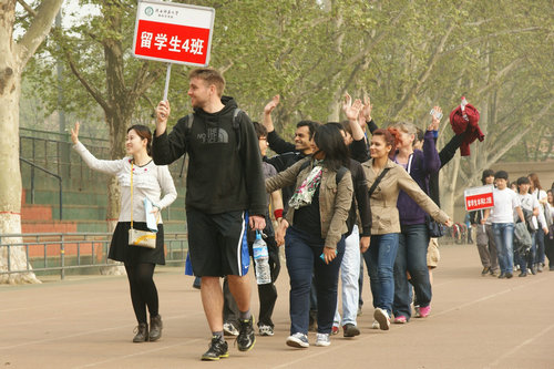 伴随着欢快的入场进行曲,来自哈萨克斯坦、美国、韩国、澳大利亚、土耳其、乌克兰等30多个国家的留学生和对外汉语教学专业的中国学生及教职工三百余人列队入场。他们有的动作整齐划一、有的带来欢快的舞蹈、有的喊着响亮的口号,2010级中国本科生还表演了独具特色的甩纸舞,现场气氛热烈欢快。