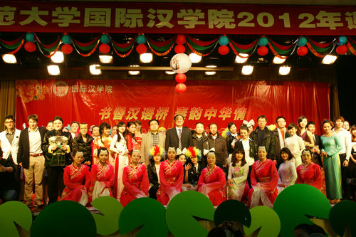 师生2012年与学院一起披荆斩棘、奋勇前行的点点滴滴,不仅有在校优秀留学生学子的学习体会,也送来了身处海外优秀学子、汉语教师的深切思念与新年祝福,浓浓情意使在场师生观众感动不已。在观众们的热情掌声中,师大微博红人曹国民叔叔(雁塔校区图书馆门卫)亲临现场,为汉学院师生泼墨挥毫,寄语新年。一座沟通世界的友谊之桥将所有观众的心灵拉近,汉语飞越国境的界限,真诚谱写友谊的华章!