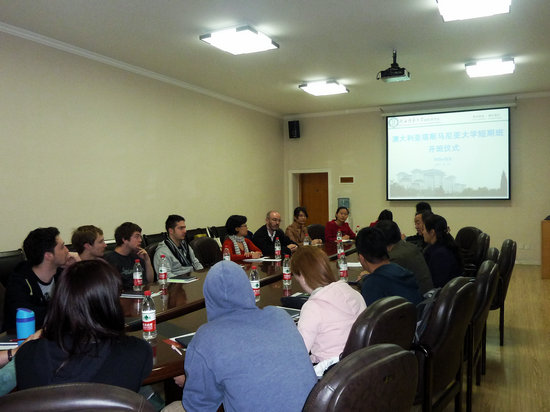 一楼会议室举行,院长张建成、副院长吴殿华、留学生管理办公室主任蔺丰辉、汉语教研室主任邵英老师等和塔斯马尼亚大学亚洲文化与语言学院副院长Mark Harrison博士、澳方带队老师林嘉惠博士及十名澳方学生参加了开班仪式。仪式由留学生管理办公室冯伟老师主持并翻译。