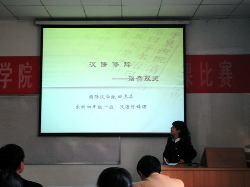 青年教师教学基本功大赛预赛拉开了序幕。首先六位评委老师和五位参加比赛的老师分别作了自我介绍。评委老师们表示将会公平、公正的对待每一位参赛选手,而五位参赛选手则表示将会把自己教学过程中最好的一面展示给大家。马晓风老师首先上台,她以《汉语有定和无定的表达》为题,在15分钟的时间里,就自己在教学过程中关于汉语语序研究所获得的一些心得作了深入浅出的阐述,得到了在场评委和观众的认可和共鸣。随后,田志华老师就《汉语修辞——谐音双关》方面的知识进行了讲解,她的课堂十分的生动有趣,大家都不自觉地与她产生互动,并在提问环节踊跃交流。另外刘琳、高红娜和张欲晓等老师也分别就古代汉语阅读、中文写作及现代汉语阅读灯方面的知识作了精彩的讲解。在参赛教师们的出色展示中,比赛现场台上台下交流充分、气氛热烈。