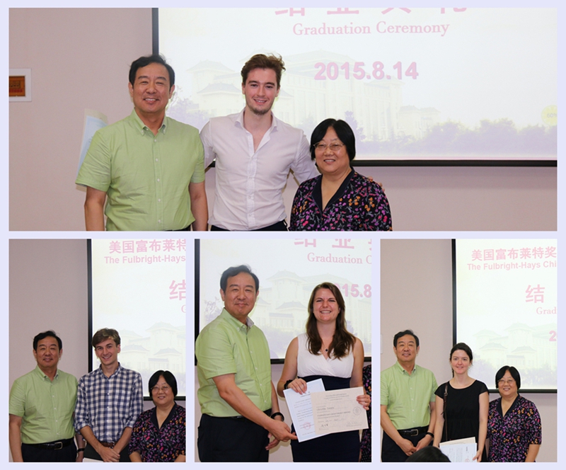 院长张建成在讲话中说,今年是美国富布莱特奖学金高级汉语进修项目开展的第3年,从最初筹备到学生们的顺利结业,始终得到了各方各级领导的高度重视。学习与体验之丰富,让参加项目进修的每一位学生在短短8个月的时间里收获了甚至比普通大学生4年还要多的宝贵财富。希望他们返回美国后,能够扮演好“中国文化大使”的角色,在中美两个国家之间、两国人民之间以及两种文化之间建立起一座友谊的桥梁。