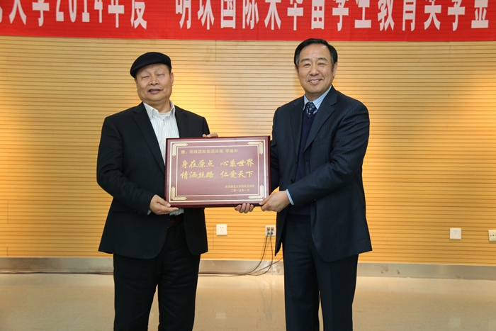 张建成院长介绍了设立明珠国际来华留学生教育奖学金的初衷及对师大留学生教育事业的重要意义,并简要介绍了李继和先生近些年来为回馈养育自己的三秦大地,在教育领域等各项公益事业中做出的卓越贡献。他说,留学生教育奖学金颁发仪式意义重大,它激励学校今后要把汉语国际教育事业做好做强,激励我们的留学生学会感恩、努力读书、提升汉语水平,同样激励我们汉学院的老师在新的历史条件下,认真教书育人,将自己的事业和国家的发展联系在一起,用更好的成绩回馈国家。随后,他代表学院将刻有“身在原点,心系世界;情洒丝路,仁爱天下”的牌匾赠与李继和先生以表感谢。