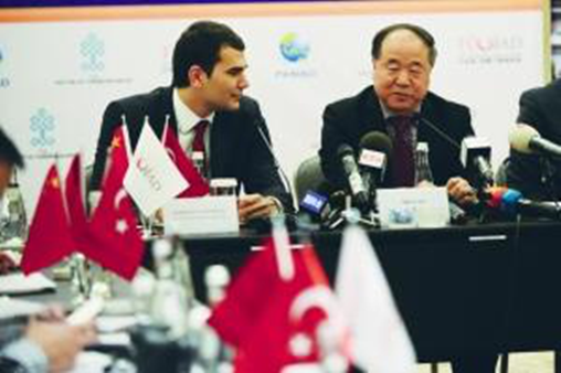 图12:学院毕业生库太在土耳其新闻发布会上给莫言担任翻译