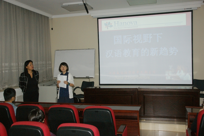 报告围绕国际学校的发展现状、国际学校老师需具备的基本素质和技能以及教学案例分析等话题展开。Julia Zhou-Gerbig认为,进入国际学校的教师应有终身学习的意识,主动地扩展自己的国际化视野,并且要敢于冒险。Julia Zhou -Gerbig结合汉语国际教育的专业方向以及她自身的教学经验,从教学理论到课堂实践,将国际学校课堂生动活泼地展现在同学们面前。互动环节中,Julia Zhou -Gerbig主任耐心地回答了同学提出的问题,并诚挚欢迎各位同学前往西安汉诺威国际学校实习和工作。