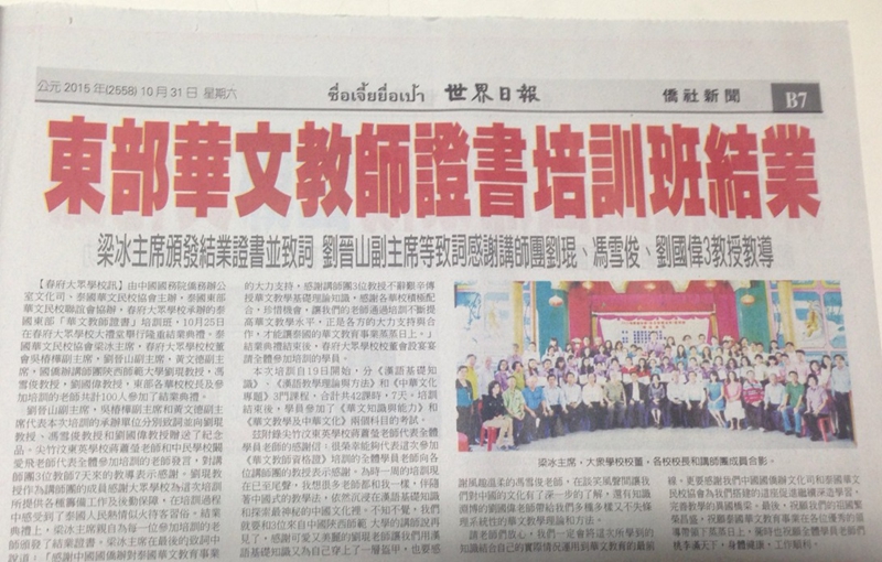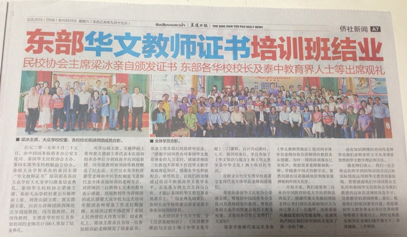 为提升海外华文教师综合素质和教学能力,顺应海外华文教育师资专业化发展需要,由中国国务院侨务办公室文化司、泰国华文民校协会主办,泰国东部华文民校联谊会协办,春府大众学校承办的泰国东部《华文教师证书》培训班于2015年10月19日——25日在春府大众学校隆重举行。此次培训由国务院侨办文化司丁子扬秘书带队,国侨办选派我校91大神