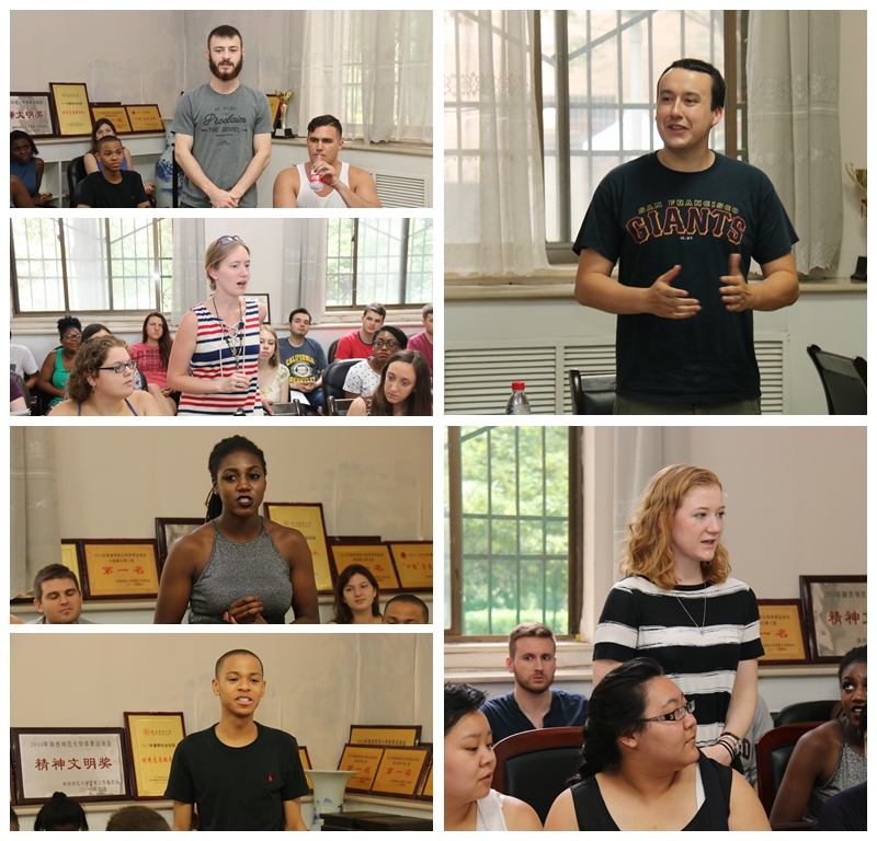 。随后,他们用流利的中文逐一作了自我介绍,表达了来到西安学习的激动与兴奋之情。据悉,本次来我校学习的28名美国学生分别来自美国哈佛大学、哥伦比亚大学、卡尔顿学院、达特茅斯学院、加州伯克利大学、威斯康星大学麦迪逊分校等世界一流的著名私立及公立大学,学生学习专业涉及国际关系、金融、中文、历史、生物等方向。