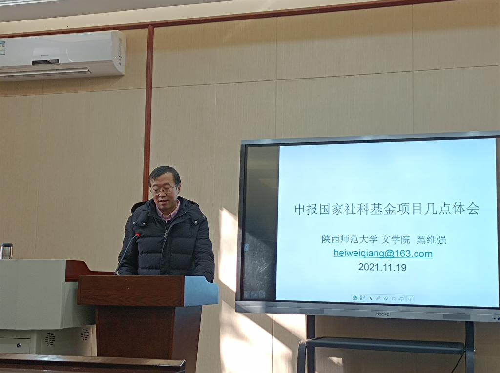 首先,黑维强教授结合自己多年在语言文字方面的国家社科基金项目申报经验,从选题新颖性、前期成果准备、研究连续性、写好申请书、多听本专业同行的意见等五个方面详细介绍了国家社科基金项目申报的要求与规范。黑教授从亲身经历出发,通过分享自己在申请中取得的进展与遇到的实际困难,鼓励大家在熟悉项目申请中的重点与难点的基础上,积极创新工作思路和方法,开拓研究领域,加强学术交流分享。