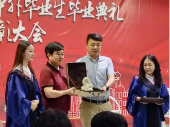 我校国际交流与合作处处长张凌云、学院党总支书记马兰向中外毕业生赠送毕业礼物。毕业班班长代表全体毕业生向学院回赠礼物。