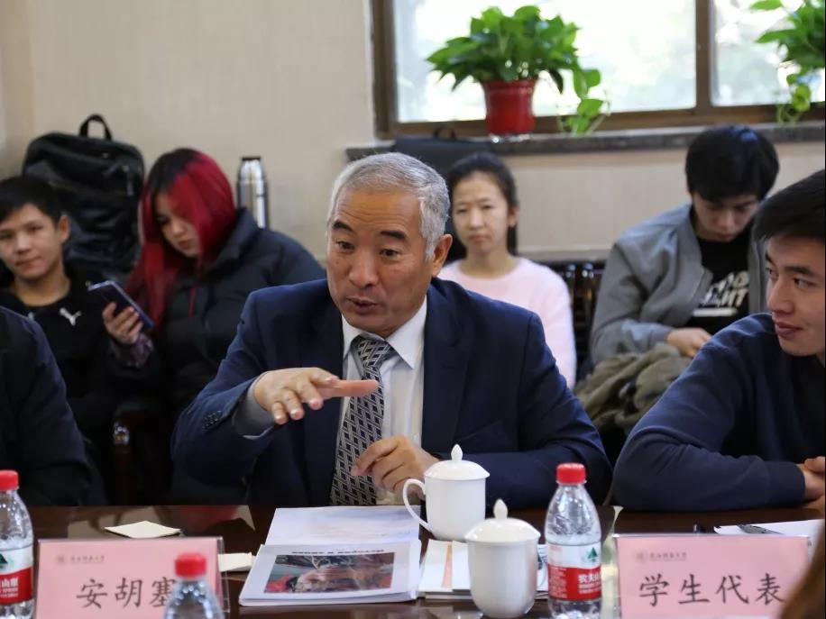 历史文化学院王国杰教授激动地表示,未来培养出的东干青年是一带一路的使者。他回顾了与安胡塞主席多次交流的历程,赞扬了安胡塞主席为了促进中哈两国经济贸易往来、文化教育交流付诸的努力。王国杰教授指出东干文化是一座挖掘不完的宝矿,他勉励东干学生们把握大好时机,用文字记录自己的学习历程,以专业为依托打好语言基础,为做东干文化的挖掘者、思考者、继承者、发扬者做知识储备和系统学习训练。