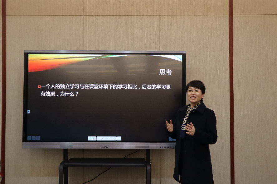 丁教授以“个人的独立学习与课堂环境下的学习相比,哪个更有效果?”这一问题来激发学生兴趣,引发学生思考,在与学生互动中带领大家走进讲座的主题。她向大家介绍互动教学作为一种教学模式,是通过营造多边互动的教学环境来激发教学双方的主动性和探索性,从而提高教学效果。丁教授从社会、教育、人本主义、心理学这四个角度讲解互动教学的理论基础,每讲一个角度都会与学生互动交流,让学生在一问一答中感受到互动教学的魅力。