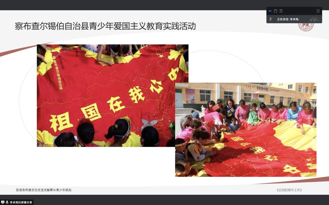 在主题领学环节,学院三名团支书根据学习安排,结合学院专业与自身实际,围绕《促进各民族交往交流交融要从青少年抓起》、《使青年一代成为推动两岸关系发展、实现民族振兴的重要力量》、《听党话、跟党走,努力成长为堪当民族复兴重任的时代新人》等指定篇目进行了领学。在分享交流环节,六位团员代表在前期自主学习和本次集中学习的基础上发表了自己的学习体会。大家一致表示实现中国梦是一场历史接力赛,作为当代青年要在实现民族复兴的赛道上奋勇争先,在服务人民、奉献社会中展现靓丽的青春风采、迸发豪迈的青春激情,努力成长为堪当民族复兴重任的时代新人。随后,学院团总支书记朱红楠就本次线上学习进行了梳理总结。