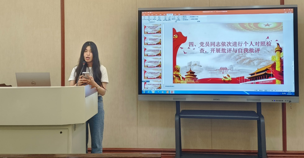 会上,党支部书记马淑滢首先对此次组织生活会的前期准备工作进行梳理,通报了党支部主题教育开展情况、深入基层调查研究情况等,并代表支部就理论学习、政治素质、能力本领、担当作为、工作作风、廉洁自律等6个方面突出问题,以及习近平总书记关于以学铸魂、以学增智、以学正风、以学促干的12条具体要求,作对照检查并提出了整改措施。