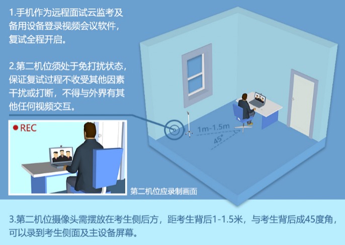 1.硬件要求。确保复试环境满足“双机位”要求,建议使用1台带有摄像头、麦克风的电脑(win7/win10/win11系统)作为主机位,1部智能手机/Pad作为监看机位,电脑端(第一机位)下载安装“钉钉”与“Todesk”远程协助软件,手机端(第二机位)则使用第二账号登陆钉钉作为监看机位。主机位置于考生正前方,用于拍摄考生免冠半身图像,副机位位于考生右后方1米,45度拍摄复试环境,能够覆盖考生复试环境和考生前方区域(包含电脑屏幕区域);复试画面分辨率不低于720p;设备工作正常,电量充足。考试期间严禁使用耳机,具体机位示意图如下1.1。